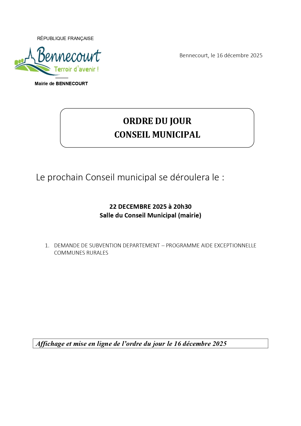 Le prochain conseil municipal se déroulera le 22 décembre 2025 à 20h30 en mairie.
