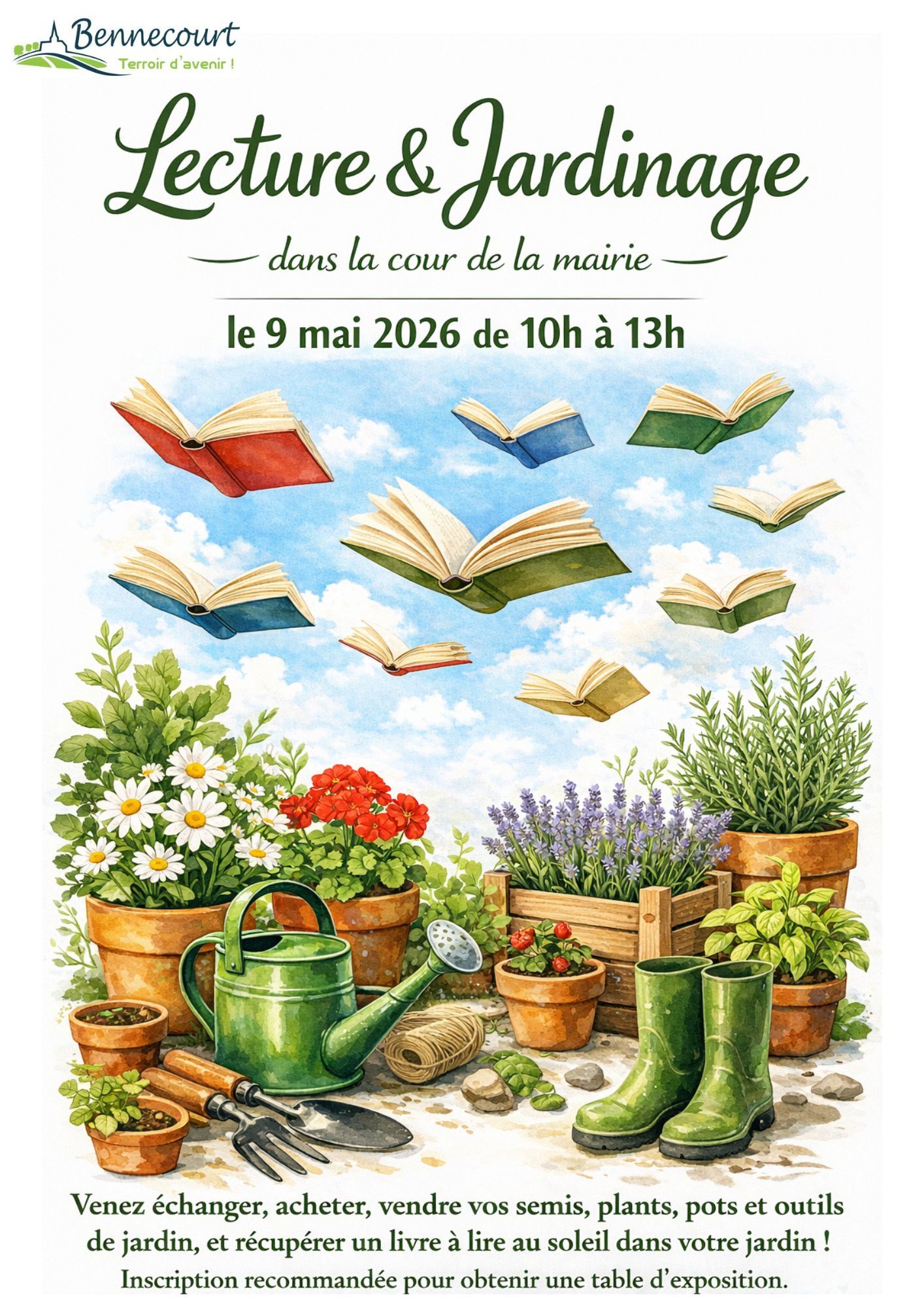 Venez échanger, acheter, vendre vos semis, plants, pots et outils de jardin, et récupérer un livre pour lire au soleil dans votre jardin, le 9 mai 2026 de 10h à 13h dans la cour de la mairie.